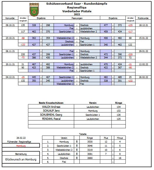 Topathlet Andreas Walch steigerte seinen Schnitt aus 2020 nochmals und belegt mit durchschnittlichen 133,63 Ringen (max: 136, min: 132) den 6.Rang aller Saarländer. Dadurch erzielte er auch jedes Mal das beste Einzelergebnis der Liga.
